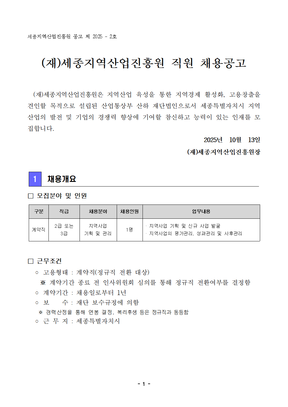[공고 제2025-2호] 세종지역산업진흥원 직원 채용 공고